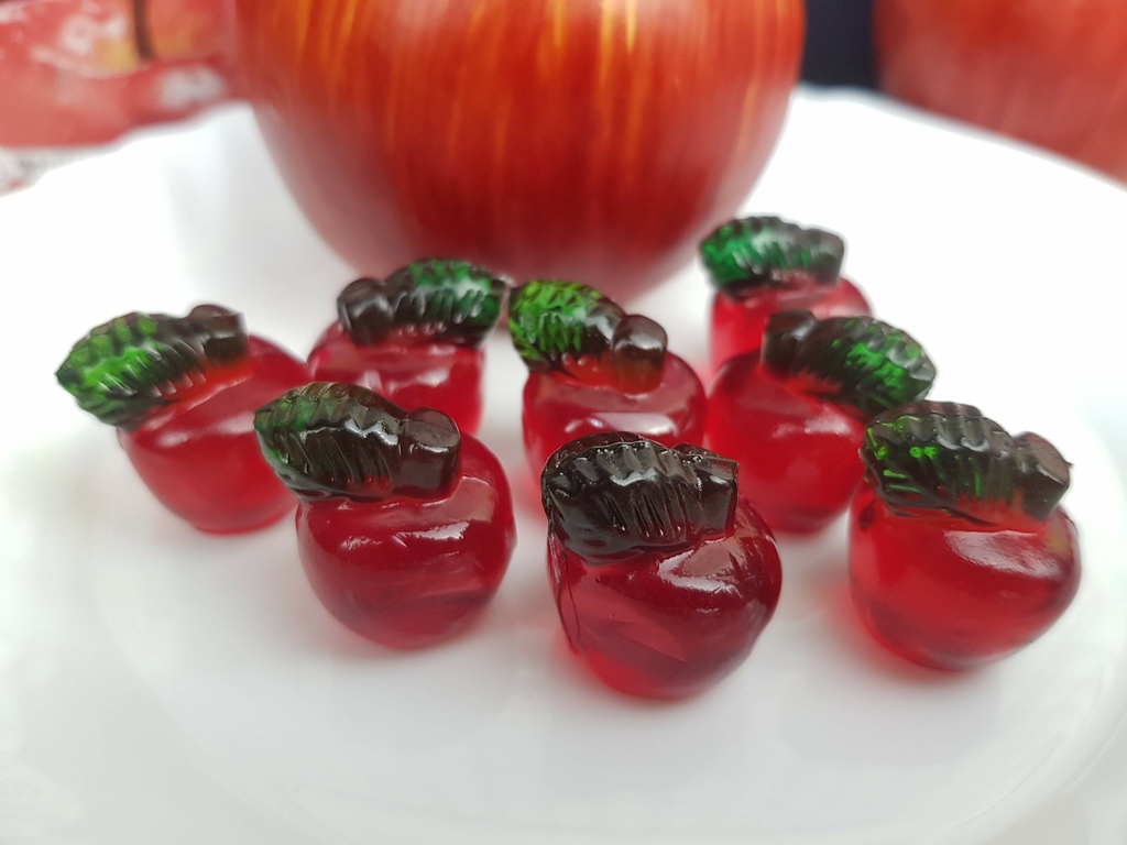 根與葉的部分是墨綠色,身體是圓鼓鼓飽滿的紅色,近拍可以看到軟糖像寶石一樣發出淡淡的光澤